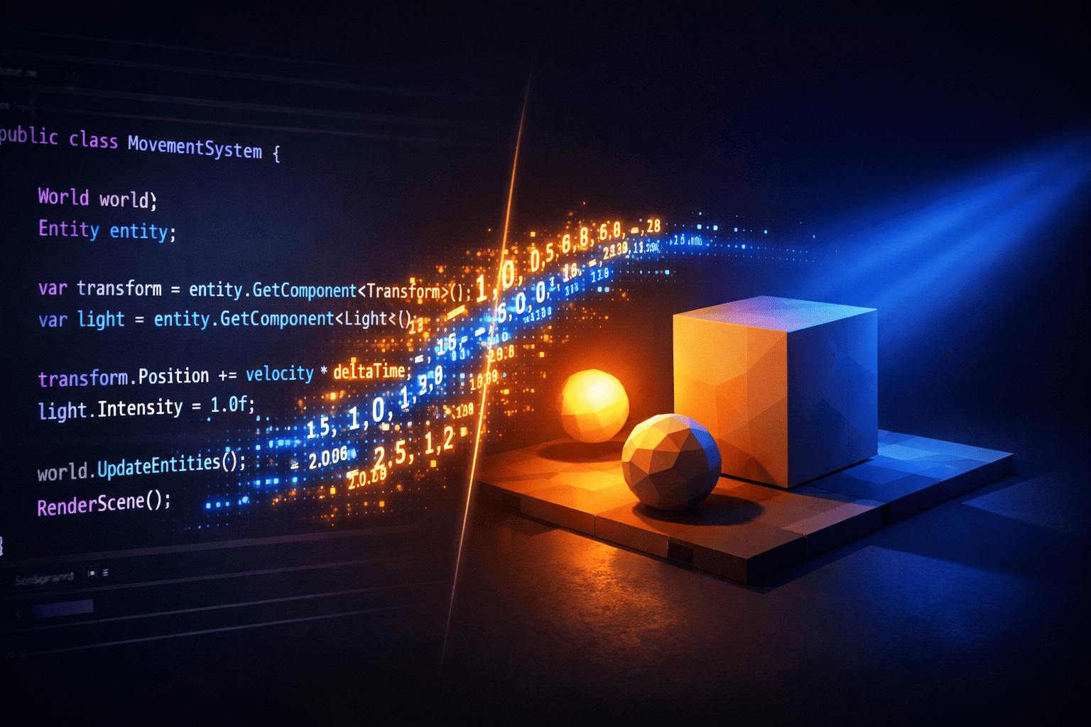 ECS makes everything composable. Adding a new feature is: define a component, write a system, register it. The Light component and LightSyncSystem were added in a single session without touching any existing code.