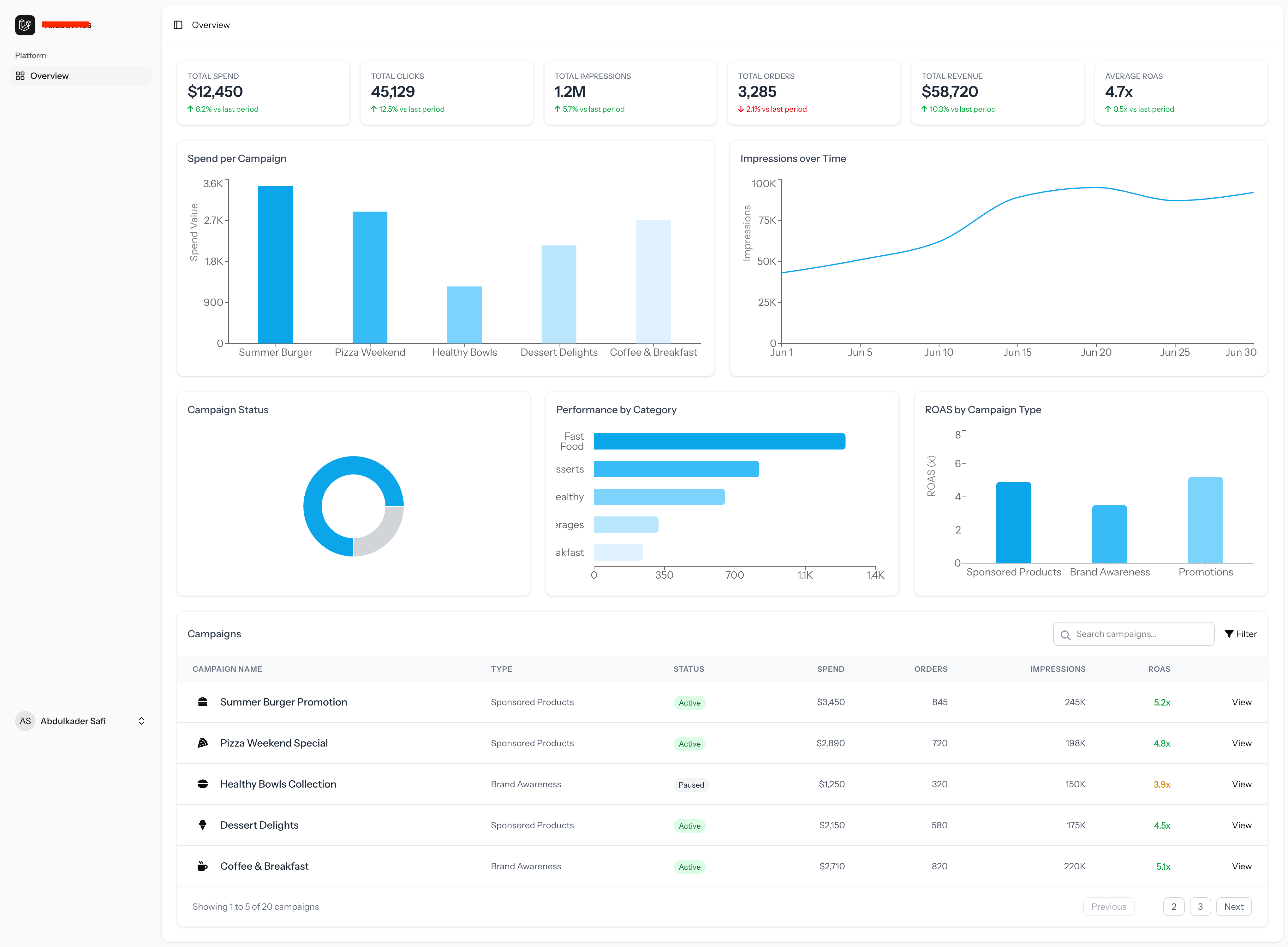 Design a dashboard UI for a food delivery business like Talabat. Include a sidebar, analytics charts, recent orders, and light theme. Responsive layout.
