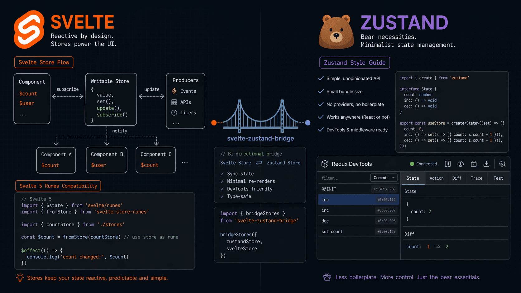 3. Reactivity inside $derived or $effect (Svelte 5 runes). If you're on Svelte 5, the wrapper I showed still works, but you'll want to test your derived values. I found one edge case where a Zustand action that set multiple keys in a single call didn't batch properly with Svelte's reactivity β Svelte 5's runes handled it fine, Svelte 4's $: statement needed an extra tick() in one spot. Worth a dev-build test before you ship.